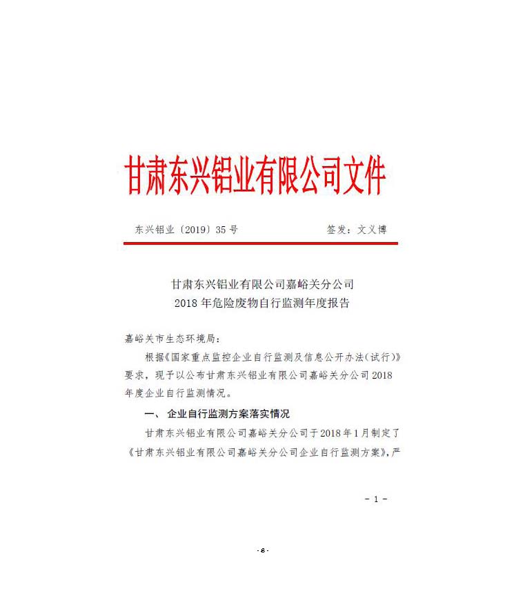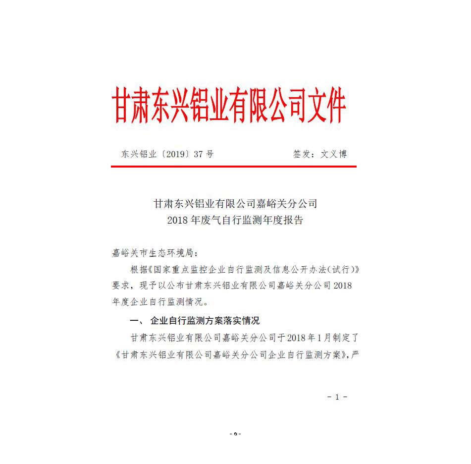 甘肅東興鋁業(yè)有限公司嘉峪關(guān)分公司2019年度環(huán)境信息公開