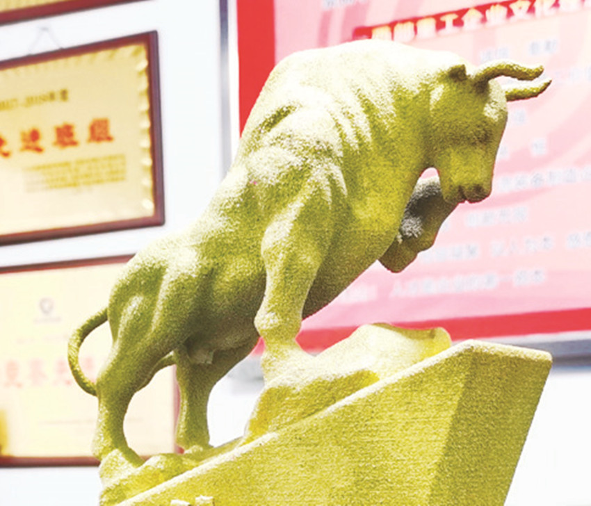 近日,西部重工公司精密鑄造分廠利用3D打印設(shè)備成功生產(chǎn)出“三牛”獎杯,彰顯“牛市”動感的形象,受到職工一致好評。該廠相關(guān)技術(shù)人員以“為民服務(wù)孺子牛、創(chuàng)新發(fā)展拓荒牛、艱苦奮斗老黃牛”“三牛精神”寓意為思路,通過設(shè)計、數(shù)字建模、打印、固化、上色,成功“打印”出牛氣沖天的雕塑獎杯,用于該公司年度表彰,同時具備批量化、個性化生產(chǎn)的能力?!             ⊥踹M  周永虎  攝